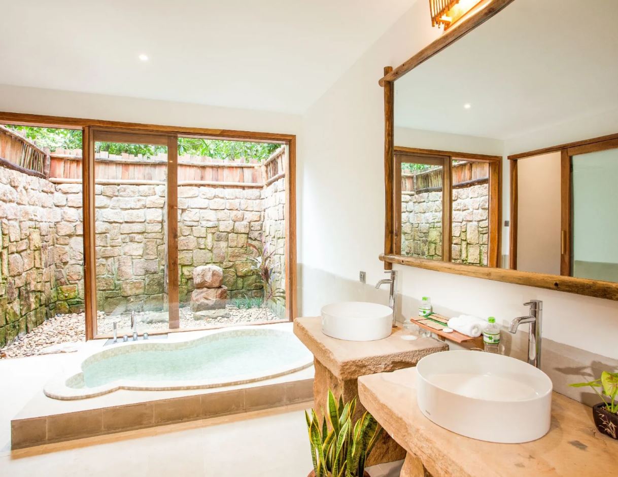 Die 81 Bungalows und Villen sind rustikal mit schönen Naturmaterialien und hellen Farben gestaltet und verfügen über Klimaanlage, Deckenventilator, gratis Internetzugang, Fernseher, Minibar, Kaffee-/Teekocher, Safe, Föhn und ein Badezimmer mit Badewanne und Regendusche. Die Beachfront Bungalows verfügen über eine spektakuläre Open-Air Badewanne. Von der Terrasse aus können Sie das Meerrauschen und die Aussicht auf die Bucht geniessen.