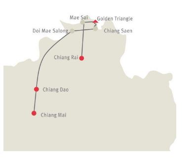 Die heutige Etappe führt durch eine grandiose Bergwelt. Auf 1800 Meter machen Sie Halt in Doi Mae Salong. Die Region ist vor allem bekannt durch ihre Teeplantagen und die prächtige Sicht auf das Tal des Mekong, das benachbarte Myanmar und weit nach Thailand hinein. Unterwegs besuchen Sie Ban Lorcha, ein Dorf des Akha Stammes. Am Nachmittag Weiterfahrt durch eine wunderbare Szenerie nach Chiang Dao.