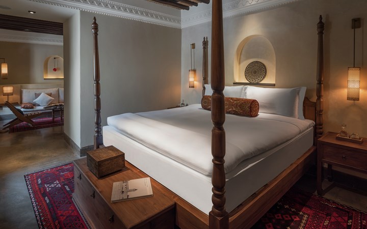 Die 53 Zimmer und Suiten im minimalistisch-arabischen Stil sind alle mit TV, Klimaanlage, Slipper, Fön, Bademantel, Safe, Dusche, Bidet und kostenfreier Minibar (keine alkoholische Getränke) ausgestattet. Unterschieden wird zwischen den Chedi Deluxe- (31-44 m2), den Chedi Grand-(45-55 m2), Al Bait Heritage Zimmern mit Patio (31-38 m2) sowie verschiedene Suite-Kategorien.